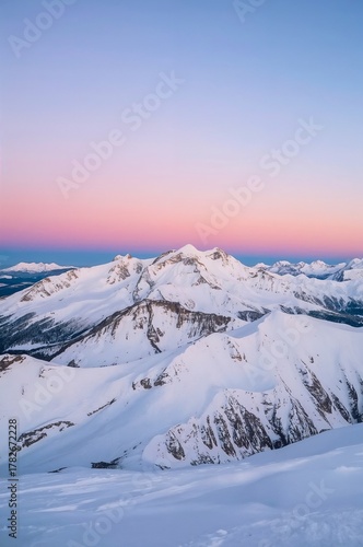 Broad, snowy mountain peaks under a soft pastel dusk sky. A tranquil winter landscape with serene, soft light.