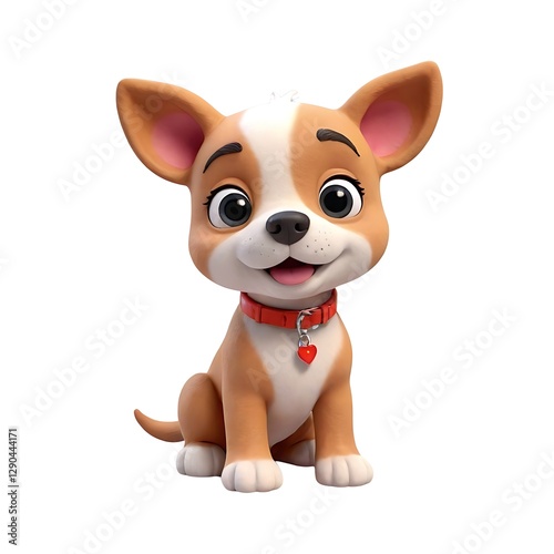 Brown and white dog with a red collar and a heart shaped tag