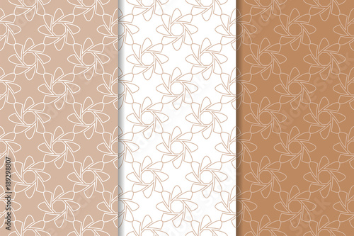 Brown and white geometric ornaments. Set of seamless patterns