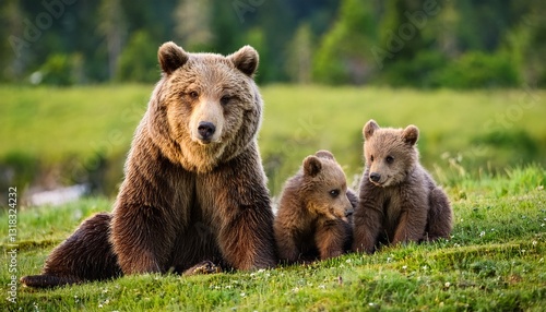 Brown bear, ursus arctos, mother with two cubs on green meadow. Generated image