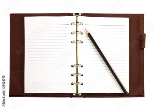 Brown canvas binder notebook with pencil isolated on white