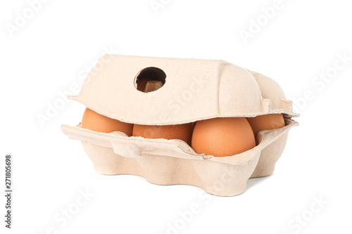 Brown chicken eggs in carton box isolated on white background