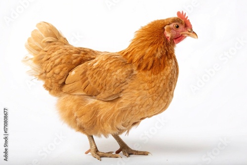 Brown farm chicken standing on white background Side view of a healthy brown hen with fluffy feathers, isolated on a white studio background, ideal for agricultural themes