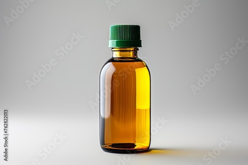 Brown glass medical bottle with clear liquid on plain background for advertising