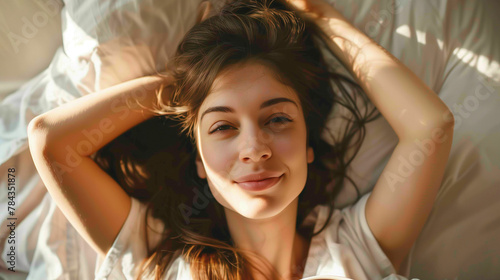 brown hair woman sipping coffee in her bed arm up behind her head