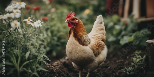 Brown Hen Exploring Garden Among Blooming Flowers in Rural Homestead Setting : Generative AI