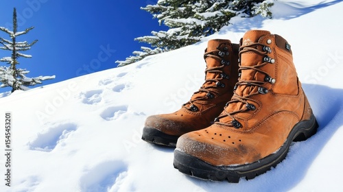 Brown Hiking Boots on Snowy Terrain Under Bright Blue Sky