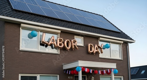 Brown house with solar panels decorated for Labor Day with gold foil balloons and patriotic garland