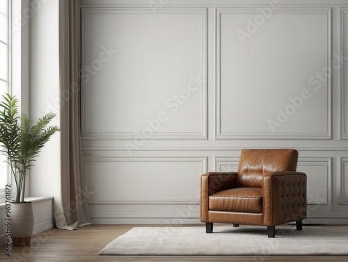 Brown Leather Armchair in a Minimalist Room with White Walls and Moldings