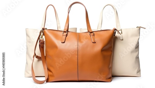 Brown leather tote bag, isolated on white background , detail, classic bag, design