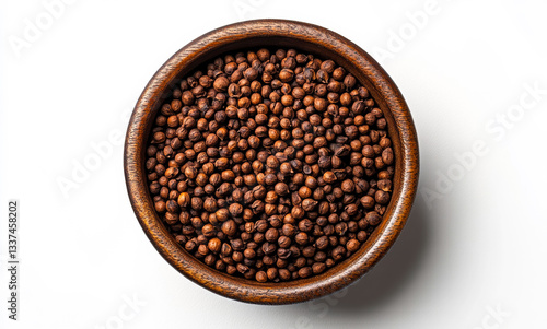 Brown seeds in wooden bowl. Close-up of brown seeds in a round wooden bowl showcased against a white background.