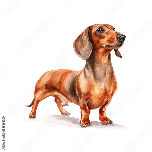 Brown short-haired dachshund illustration, playful sausage dog standing, hand-painted art, white background
