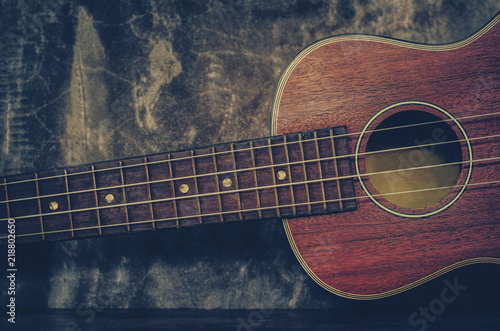 Brown ukulele guitar portrait on texture Wall plaster ,Vintage dark tone holiday relax break time with music or art concept