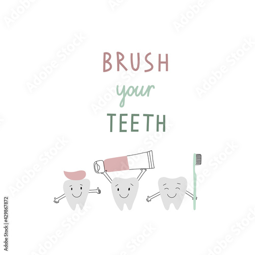Brush your teeth lettering. Vector color hand drawn kids oral care illustration. Dental hygiene for child. Funny teeth with toothbrush and toothpaste. Isolated on white