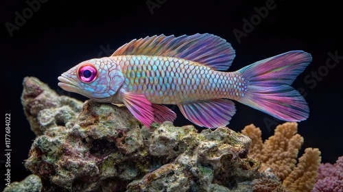 Bryaninops natans with pink eyes perched on coral exemplifying the beauty of vibrant marine ecosystems and colorful underwater life