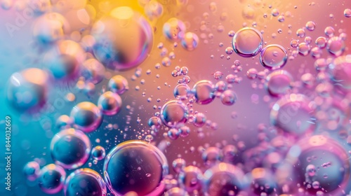 Bubbly liquid texture, close-up of bubbles forming abstract patterns, vibrant colors with a glossy finish.