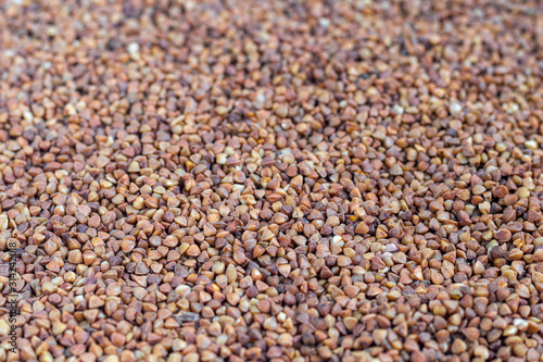 Buckwheat groats are scattered on a light background. Dark texture and background.
