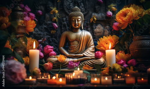 Buddha Statue surrounded by colorful flowers