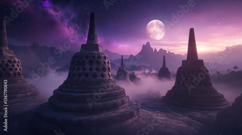 Buddhist Stupas Surrounded by Mystical Landscape Under Full Moon and Starry Sky