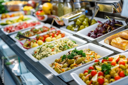 Buffet table with plates full of delicious salads and appetizers ready for guests
