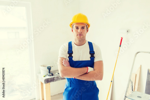 builder in hardhat with working tools indoors