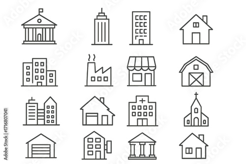 Building line icon set. Real estate and construction icons. House, office, bank, hospital, factory, shop. Thin line vector pictogram collection for web and apps. Editable stroke.