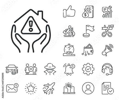 Building warning sign. Salaryman, gender equality and alert bell outline icons. House protection line icon. Home insurance symbol. House protection line sign. Spy or profile placeholder icon. Vector