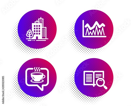 Buildings, Coffee and Investment icons simple set. Halftone dots button. Search text sign. City architecture, Cafe, Economic statistics. Open book. Business set. Classic flat buildings icon. Vector