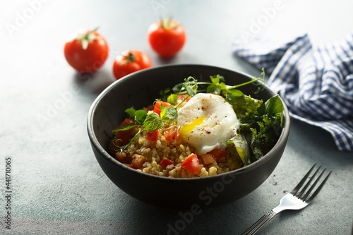 Bulgur with tomato and poached egg