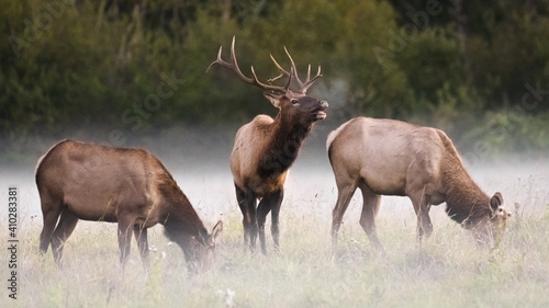 Bull elk with two females calling on a misty morning at Meadowbrook farm in Snoqualmie to the east of Seattle