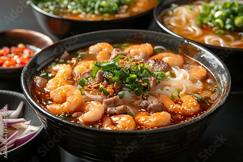 Bun Bo Hue on a black background top view Vietnamese Cuisine. Concept Vietnamese Cuisine, Food Photography, Top View Shot, Bun Bo Hue, Black Background