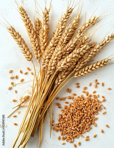 Bundled wheat stalks and kernels scattered on surface.