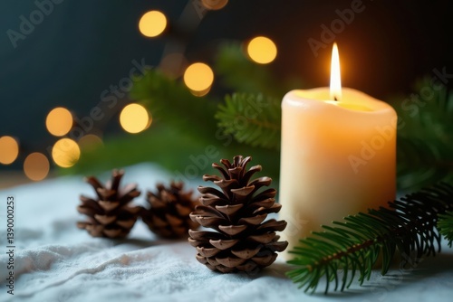 Burning candle, pine cones, white linen, festive lights, German Christmas greeting , glow, christmas eve