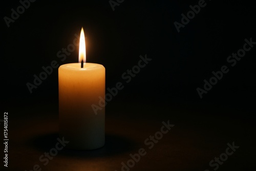 Burning candle with soft flame glowing in darkness on black background, symbolizing light, calmness, and mindfulness in abstract atmosphere. Ai generative