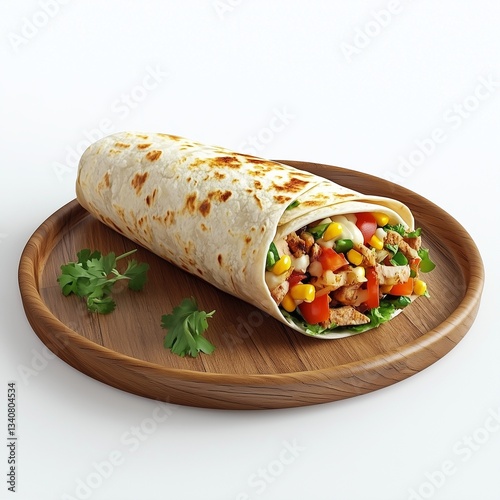 Burrito vegetable and meat smoked wrapped by flat bread on wooden plate