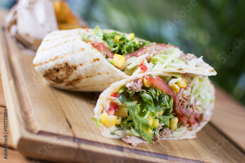 Burrito with grilled chicken and vegetables. Shawarma from juicy beef, lettuce, tomatoes, cucumbers, paprika and onion in pita bread.