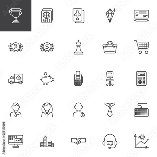 Business and finance line icons set. linear style symbols collection, outline signs pack. vector graphics. Set includes icons as Bank check payment, Piggy bank and coin money, Business handshake