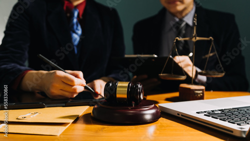 Business and lawyers discussing contract papers with brass scale on desk in office. Law, legal services, advice, justice and law concept picture with film grain effect