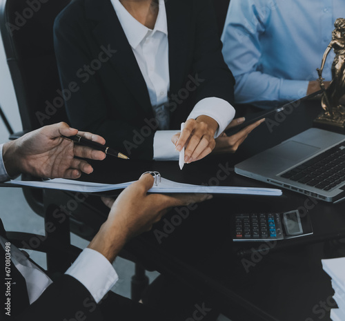 Business and lawyers discussing contract papers with brass scale on desk in office. Law, legal services, advice, justice and law concept picture with film grain effect