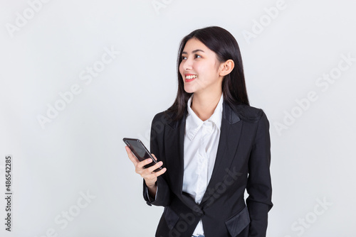 business asian woman wearing office clothing successful hold smart phone mobile and computer laptop , Technology communication lifestyles concept.