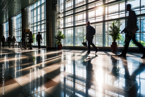 Business center lobby with blurred figures of businessmen. Busy office hours idea