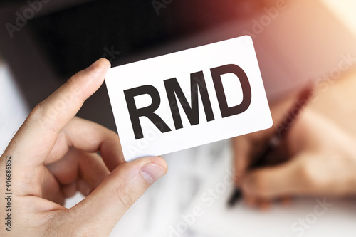 Business concept. Card with letters RMD - Required Minimum Distribution.