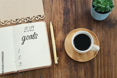 Business concept of top view 2021 goals list with notebook, cup of coffee over wooden desk