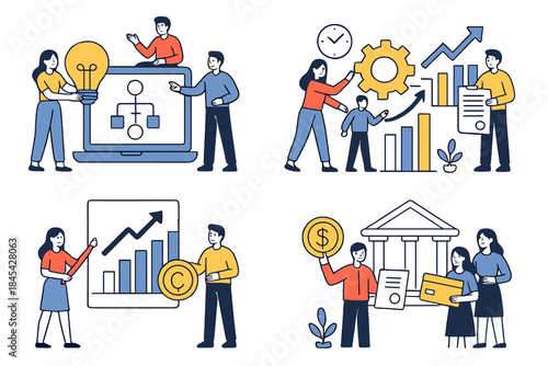 Business concepts set showing idea generation, financial growth, teamwork, and banking services