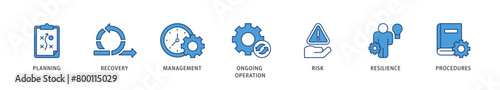 Business continuity icons set collection illustration of management, ongoing operation, risk, resilience, and procedures icon live stroke and easy to edit