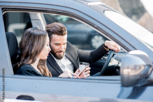Business couple having a conversation while driving a car in the city