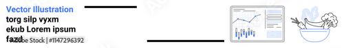 Business dashboard with growth charts, fresh bowl of salad with vegetables. Ideal for business performance, healthy lifestyle, data analytics, fresh produce, wellness, nutrition, website design
