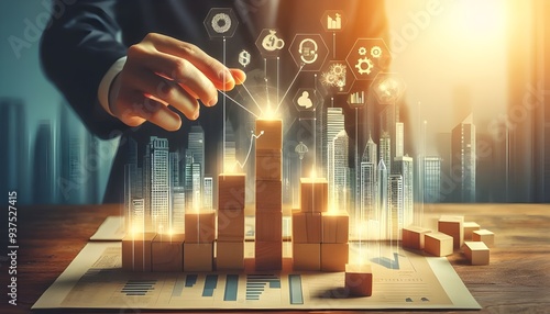 business development and growth success process concept, close up hand arranging wood block stacking, background with copy space