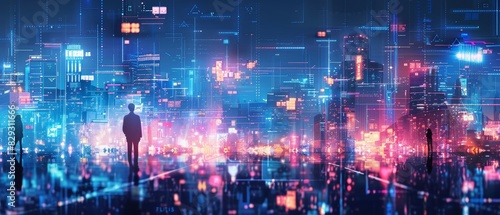Business, Finance and Investment Concepts: The future of digital technology, Double exposure of business people and city landscape