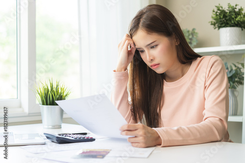 Business financial concept, stressed asian young woman hand checking list statement of credit card for calculate accounting expense, tax for payment on due deadline, trying to find money to pay debt.